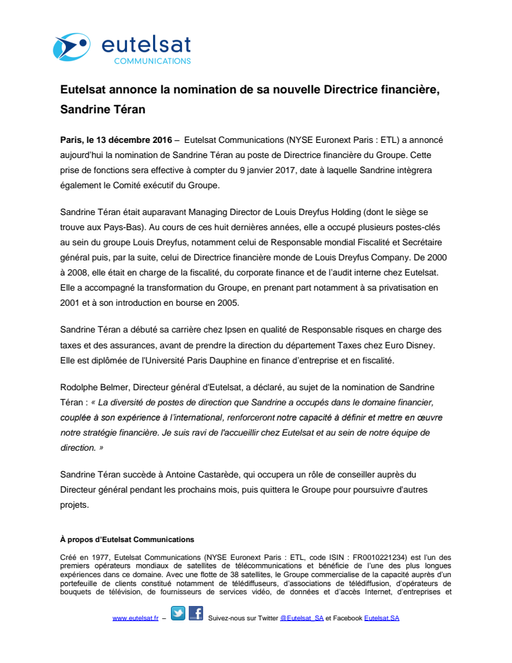 Eutelsat Communications (NYSE Euronext Paris : ETL) a annoncé aujourd’hui la nomination de Sandrine Téran au poste de Directrice financière du Groupe. Cette prise de fonctions sera effective à compter du 9 janvier 2017, date à laquelle Sandrine intègrera également le Comité exécutif du Groupe.
