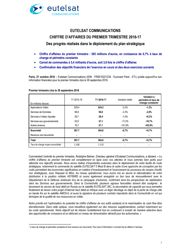 EUTELSAT COMMUNICATIONS CHIFFRE D’AFFAIRES DU PREMIER TRIMESTRE 2016-17