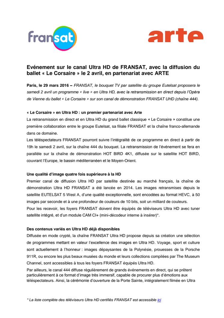Evénement sur le canal Ultra HD de FRANSAT, avec la diffusion du ballet « Le Corsaire » le 2 avril, en partenariat avec ARTE