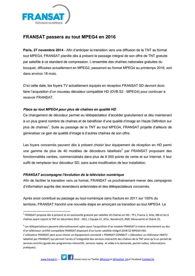 Afin d’anticiper la transition vers une diffusion de la TNT au format tout MPEG4, FRANSAT planifie dès à présent le passage intégral de son offre de TNT gratuite par satellite à ce standard de compression. L’ensemble des chaînes nationales gratuites du bouquet, diffusées actuellement en MPEG2, passeront au format MPEG4 au printemps 2016, soit dans environ 18 mois.