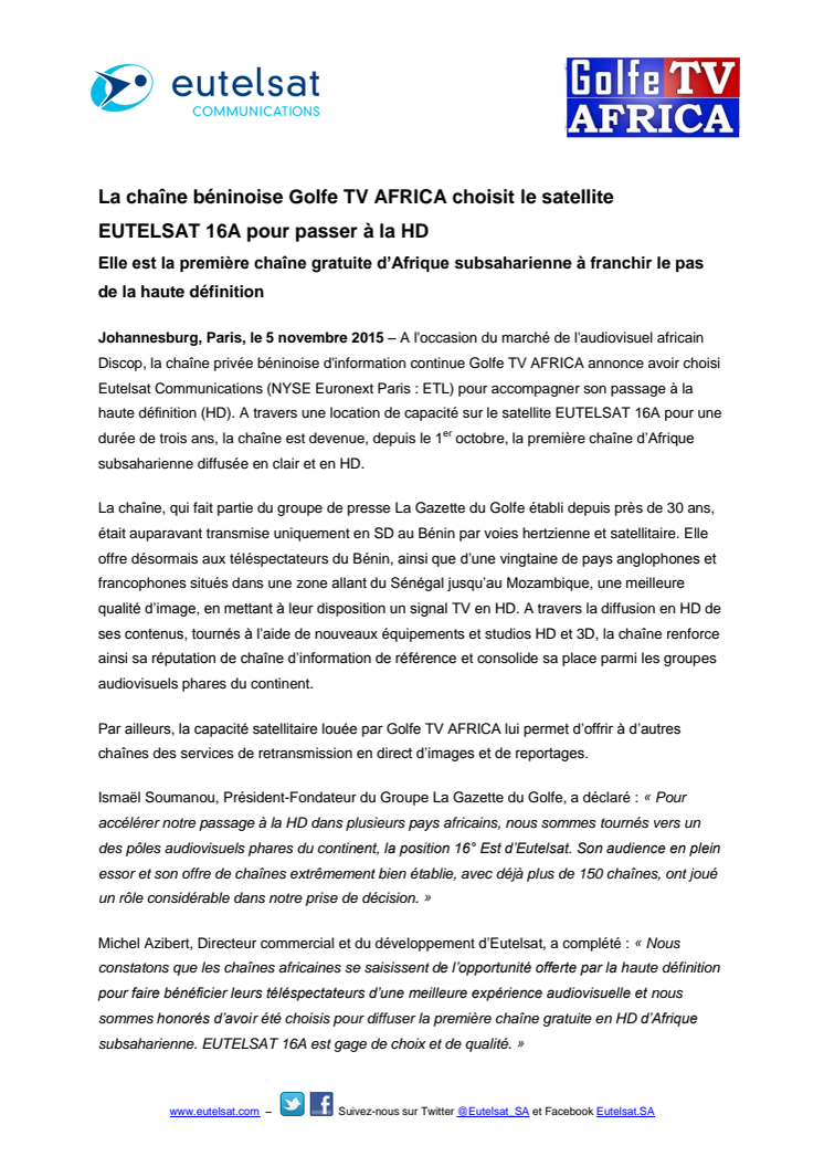 A l'occasion du marché de l'audiovisuel africain Discop, la chaîne privée béninoise d'information continue Golfe TV AFRICA annonce avoir choisi Eutelsat Communications (NYSE Euronext Paris : ETL) pour accompagner son passage à la haute définition (HD).