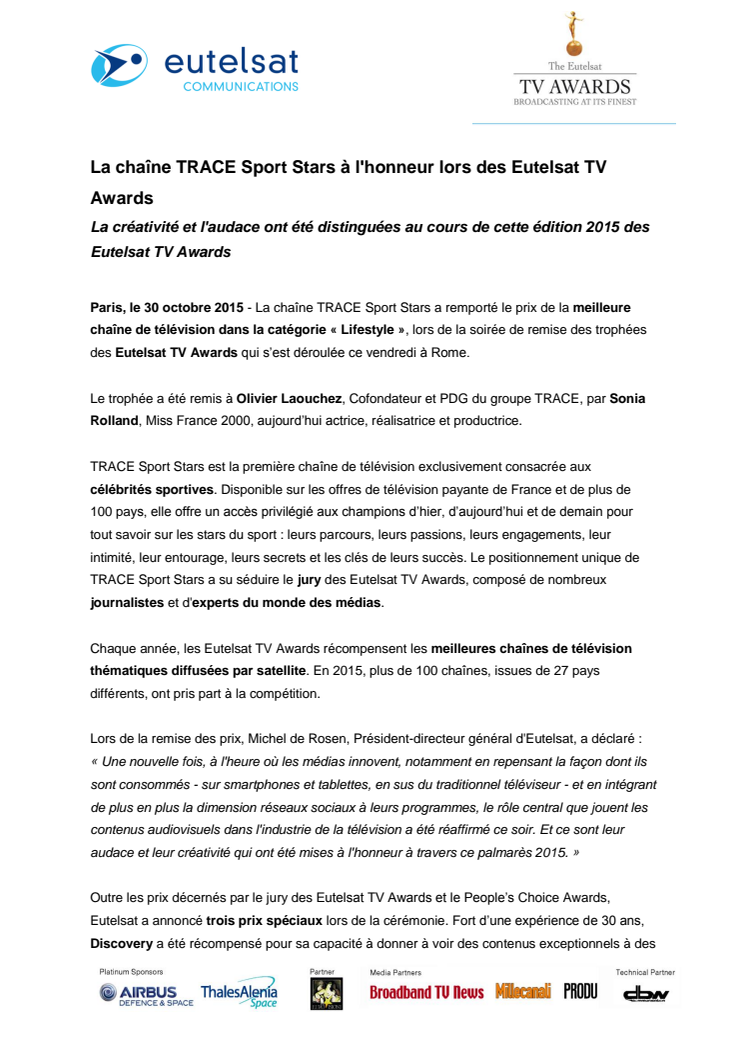 La créativité et l'audace ont été distinguées au cours de cette édition 2015 des Eutelsat TV Awards