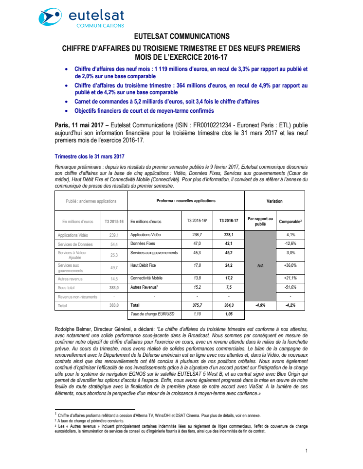 Paris, 11 mai 2017 – Eutelsat Communications (ISIN : FR0010221234 - Euronext Paris : ETL) publie aujourd’hui son information financière pour le troisième trimestre clos le 31 mars 2017 et les neuf premiers mois de l’exercice 2016-17.