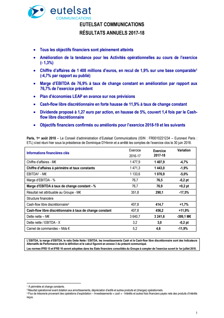 Paris, 1er août 2018 – Le Conseil d’administration d’Eutelsat Communications (ISIN : FR0010221234 – Euronext Paris : ETL) s’est réuni hier sous la présidence de Dominique D’Hinnin et a arrêté les comptes de l’exercice clos le 30 juin 2018.