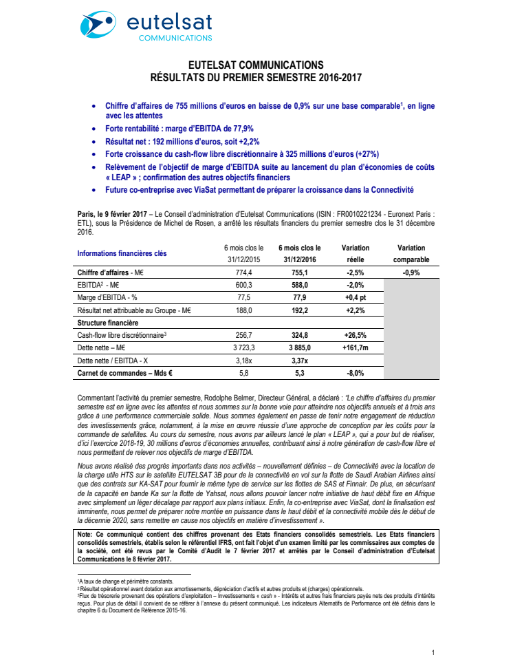 Paris, le 9 février 2017 – Le Conseil d’administration d’Eutelsat Communications (ISIN : FR0010221234 - Euronext Paris : ETL), sous la Présidence de Michel de Rosen, a arrêté les résultats financiers du premier semestre clos le 31 décembre 2016.