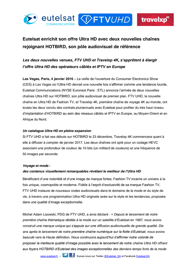 Las Vegas, Paris, 4 janvier 2016 – La veille de l’ouverture du Consumer Electronics Show (CES) à Las Vegas où l’Ultra HD devrait une nouvelle fois s’affirmer comme une tendance lourde, Eutelsat Communications (NYSE Euronext Paris : ETL) annonce l’arrivée de deux nouvelles chaînes Ultra HD sur HOTBIRD, son pôle audiovisuel de premier plan. FTV UHD, la nouvelle chaîne en Ultra HD de Fashion TV, et Travelxp 4K, première chaîne de voyage 4K au monde, ont toutes les deux conclu des contrats pluriannuels avec Eutelsat pour profiter du très haut niveau d’implantation d’HOTBIRD au sein des réseaux câblés et IPTV en Europe, au Moyen-Orient et en Afrique du Nord.