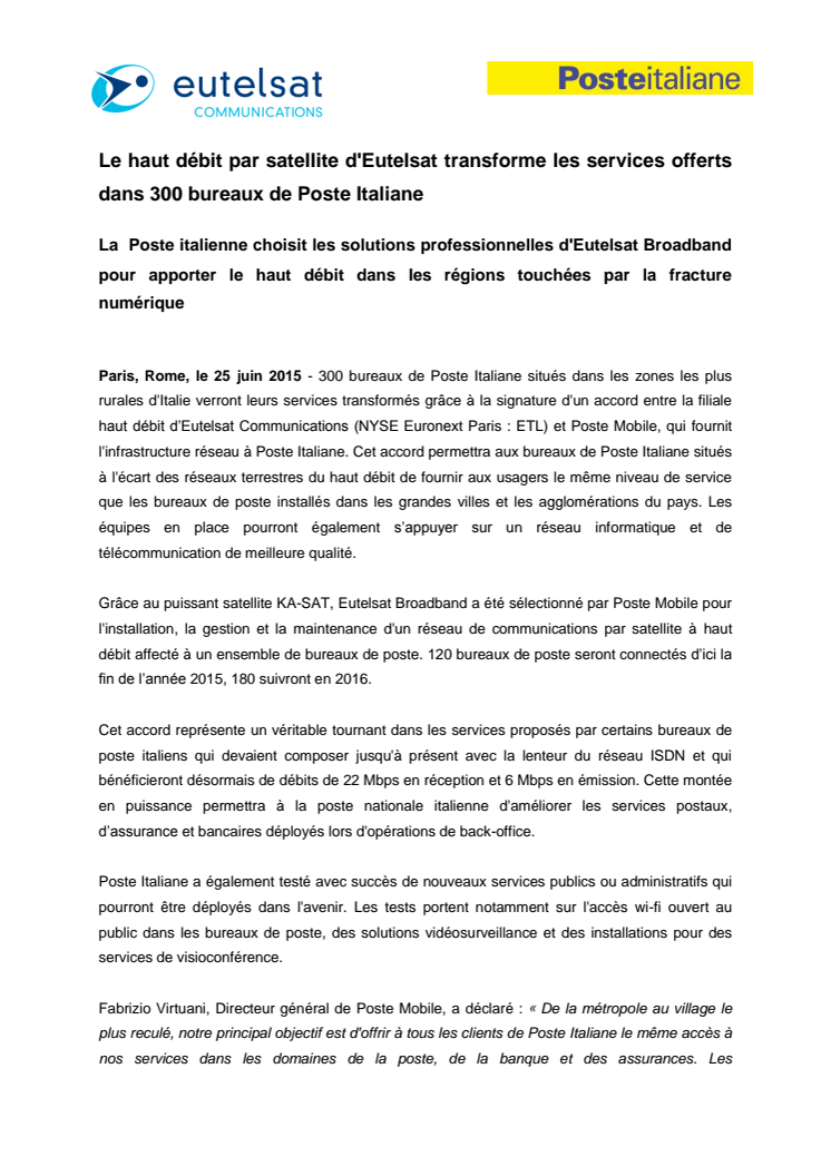 Paris, Rome, le 25 juin 2015 - 300 bureaux de Poste Italiane situés dans les zones les plus rurales d'Italie verront leurs services transformés grâce à la signature d'un accord entre la filiale haut débit d’Eutelsat Communications (NYSE Euronext Paris : ETL) et Poste Mobile, qui fournit l'infrastructure réseau à Poste Italiane. Cet accord permettra aux bureaux de Poste Italiane situés à l'écart des réseaux terrestres du haut débit de fournir aux usagers le même niveau de service que les bureaux de poste installés dans les grandes villes et les agglomérations du pays. Les équipes en place pourront également s’appuyer sur un réseau informatique et de télécommunication de meilleure qualité.