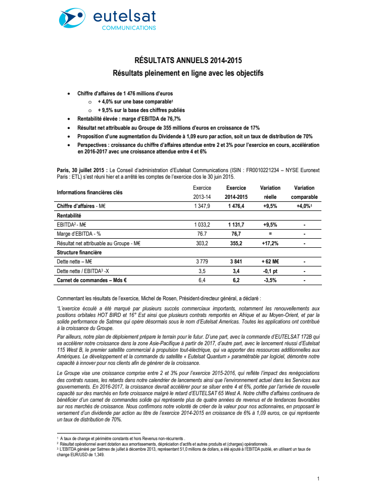 Paris, 30 juillet 2015 : Le Conseil d’administration d’Eutelsat Communications (ISIN : FR0010221234 – NYSE Euronext Paris : ETL) s’est réuni hier et a arrêté les comptes de l’exercice clos le 30 juin 2015.
