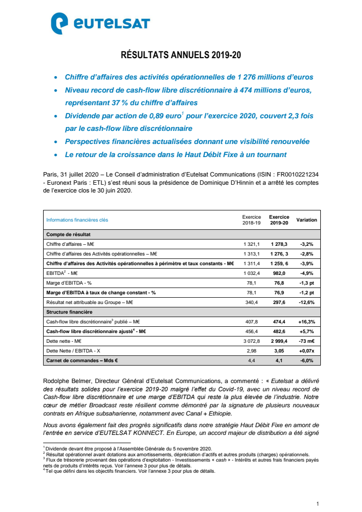 Paris, 31 juillet 2020 – Le Conseil d’administration d’Eutelsat Communications (ISIN : FR0010221234 - Euronext Paris : ETL) s’est réuni sous la présidence de Dominique D’Hinnin et a arrêté les comptes de l’exercice clos le 30 juin 2020.
