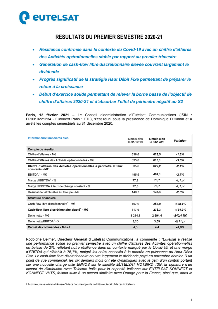 Ce communiqué contient des chiffres provenant des Etats financiers consolidés semestriels. Les Etats financiers consolidés semestriels, établis selon le référentiel IFRS, ont fait l’objet d’un examen limité par les commissaires aux comptes de la société, ont été revus par le Comité d’audit le 10 février 2021 et arrêtés par le Conseil d’administration d’Eutelsat Communications le 11 février 2021. L’EBITDA, la marge d’EBITDA, le ratio Dette Nette / EBITDA, les investissements Cash, le Cash-flow libre discrétionnaire et le Cash-flow libre discrétionnaire ajusté sont des Indicateurs Alternatifs de Performance dont la définition et le calcul figurent en annexe 3 du présent communiqué.