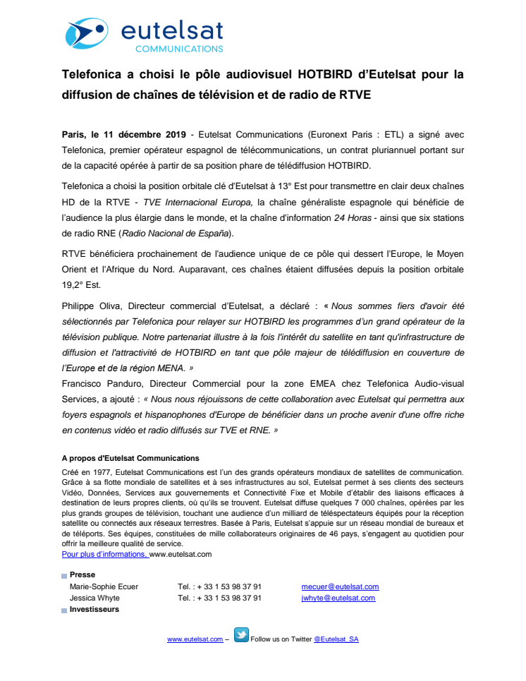 Paris, le 11 décembre 2019 - Eutelsat Communications (Euronext Paris : ETL) a signé avec Telefonica, premier opérateur espagnol de télécommunications, un contrat pluriannuel portant sur de la capacité opérée à partir de sa position phare de télédiffusion HOTBIRD.