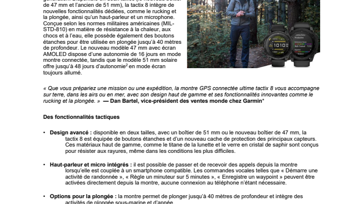 « Que vous prépariez une mission ou une expédition, la montre GPS connectée ultime tactix 8 vous accompagne sur terre, dans les airs ou en mer, avec son design haut de gamme et ses fonctionnalités innovantes comme le rucking et la plongée. » — Dan Bartel, vice-président des ventes monde chez Garmin*