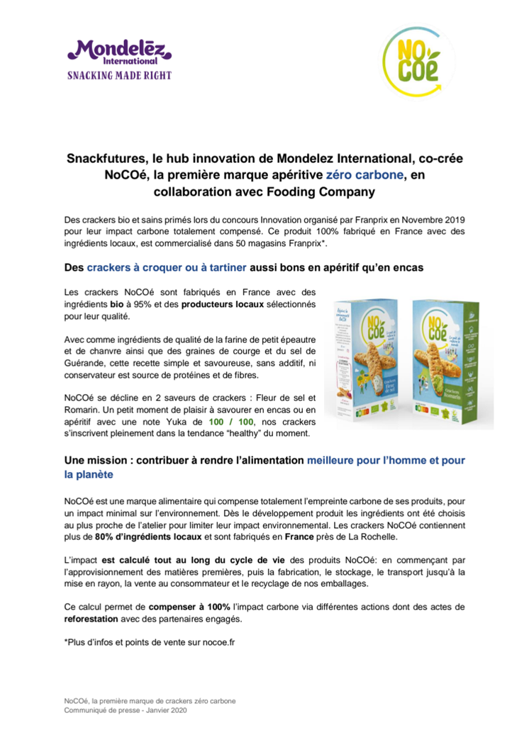 Snackfutures, le hub innovation de Mondelez International, co-crée NoCOé, la première marque apéritive zéro carbone, en collaboration avec Fooding Company