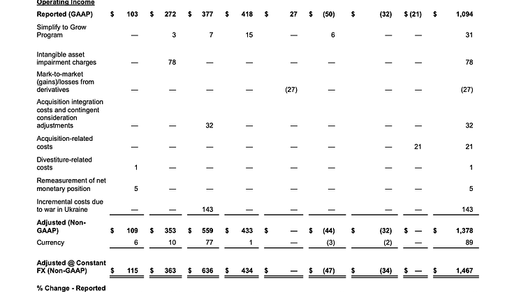 Operating income decreased $189 million and operating income margin was 14.1 percent, down360 basis points primarily due to incremental costs incurred due to the war in Ukraine, lowermark-to-market gains from derivatives, intangible asset impairment charges incurred in 2022,higher acquisition integration costs and lower Adjusted Operating Income1 margin, partially offsetby lower restructuring costs. Adjusted Operating Income increased $175 million at constantcurrency while Adjusted Operating Income margin decreased 20 basis points to 17.7 percent, withinput cost inflation and unfavorable mix, mostly offset by pricing and SG&A leverage.