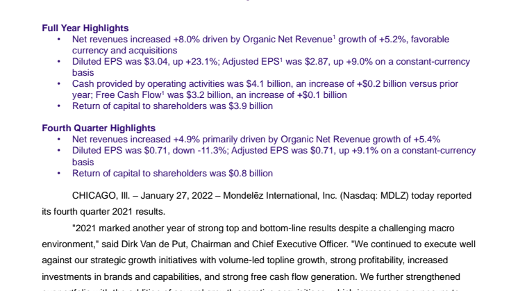 CHICAGO, Ill. – January 27, 2022 – Mondelēz International, Inc. (Nasdaq: MDLZ) today reportedits fourth quarter 2021 results.
