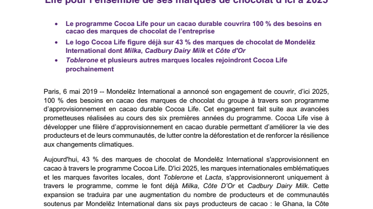 Paris, 6 mai 2019 -- Mondelēz International a annoncé son engagement de couvrir, d’ici 2025, 100 % des besoins en cacao des marques de chocolat du groupe à travers son programme d’approvisionnement en cacao durable Cocoa Life. Cet engagement fait suite aux avancées prometteuses réalisées au cours des six premières années du programme. Cocoa Life vise à développer une filière d’approvisionnement en cacao durable permettant d’améliorer la vie des producteurs et de leurs communautés, de lutter contre la déforestation et de renforcer la résilience aux changements climatiques.
