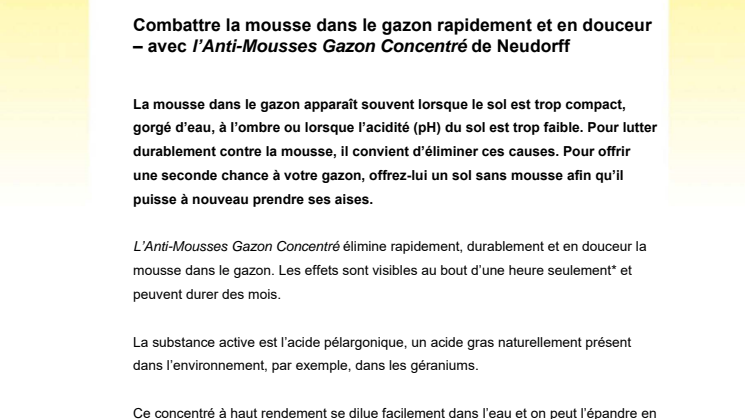 L’Anti-Mousses Gazon Concentré élimine rapidement, durablement et en douceur la mousse dans le gazon. Les effets sont visibles au bout d’une heure seulement* et peuvent durer des mois.