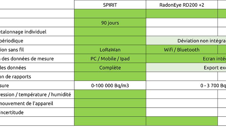 Alors que RadonEye montre rapidement ses limites dans une utilisation professionnelle, SPIRIT par Radonova se place comme un instrument réellement adapté aux professionnels. Alors même que les performances de mesure pures de SPIRIT et de RadonEye sont comparables, c’est-à-dire présentant un temps de réponse et une sensibilité du même ordre, :