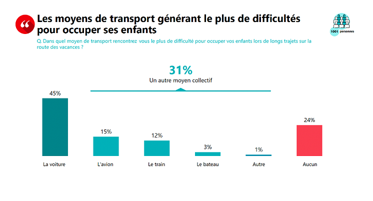 Le moyen de transport sur de longs trajets créant le plus de difficultés aux parents pour occuper leurs enfants est la voiture pour 45 % d’entre eux