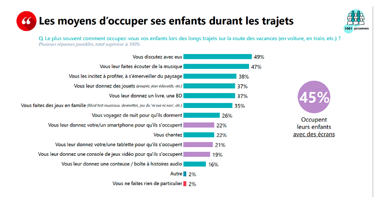 Le plus souvent, les parents recourent aux solutions les plus basiques, celles à portée de main : discuter avec ses enfants (49%) ou leur faire écouter de la musique (47%). 38% optent même pour les ressources naturelles à disposition et les incitent à s’émerveiller du paysage. Un parent sur quatre tente de ruser, en voyageant de nuit pour qu’ils dorment pendant toute la durée du trajet (26%). Certains se montrent confiants dans la capacité d’autonomie de leurs enfants et leur donnent des jouets (37%) ou des livres/BD (37%), pour qu’ils se divertissent seuls. Les jeux (35%) ou chansons (22%) en famille constituent une option privilégiée par une partie des parents.
