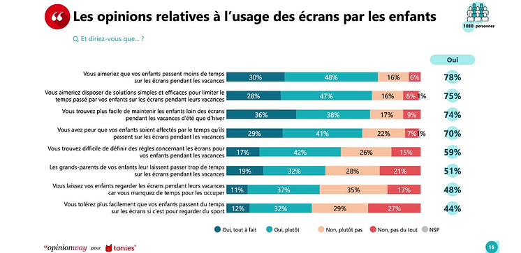 tonies® France publie ci-dessous les résultats d’une enquête réalisée par OpinionWay auprès de 1030 familles françaises entre le 16 et le 24 janvier 2024