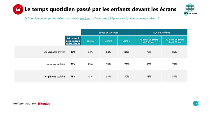 Étude réalisée par Opinionway pour tonies® auprès de 1030 personnes, représentatives de la population française de parents d’enfants âgés de 3 à 10 ans du 16 au 24 janvier 2024.
