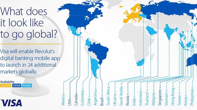Revolut propose un éventail de services financiers numériques liés à une carte Visa par le biais d’une application mobile (change, budgétisation et transfert d’argent entre particuliers). Fort du succès de leur accord européen, Visa permettra à Revolut de lancer son offre initialement en Australie, au Brésil, au Canada, au Japon, en Nouvelle-Zélande, en Russie, à Singapour etaux États-Unis, ainsi qu’en Argentine, au Chili, en Colombie, à Hong Kong, en Inde, en Indonésie, en Corée, en Malaisie, au Mexique, aux Philippines, en Arabie Saoudite, en Afrique du Sud, à Taïwan, en Thaïlande, en Ukraine et au Vietnam.