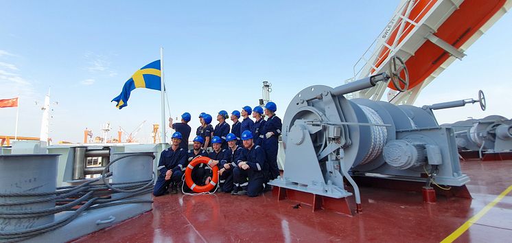 Fure Viten crew hoisting the Swedish flag after delivery.