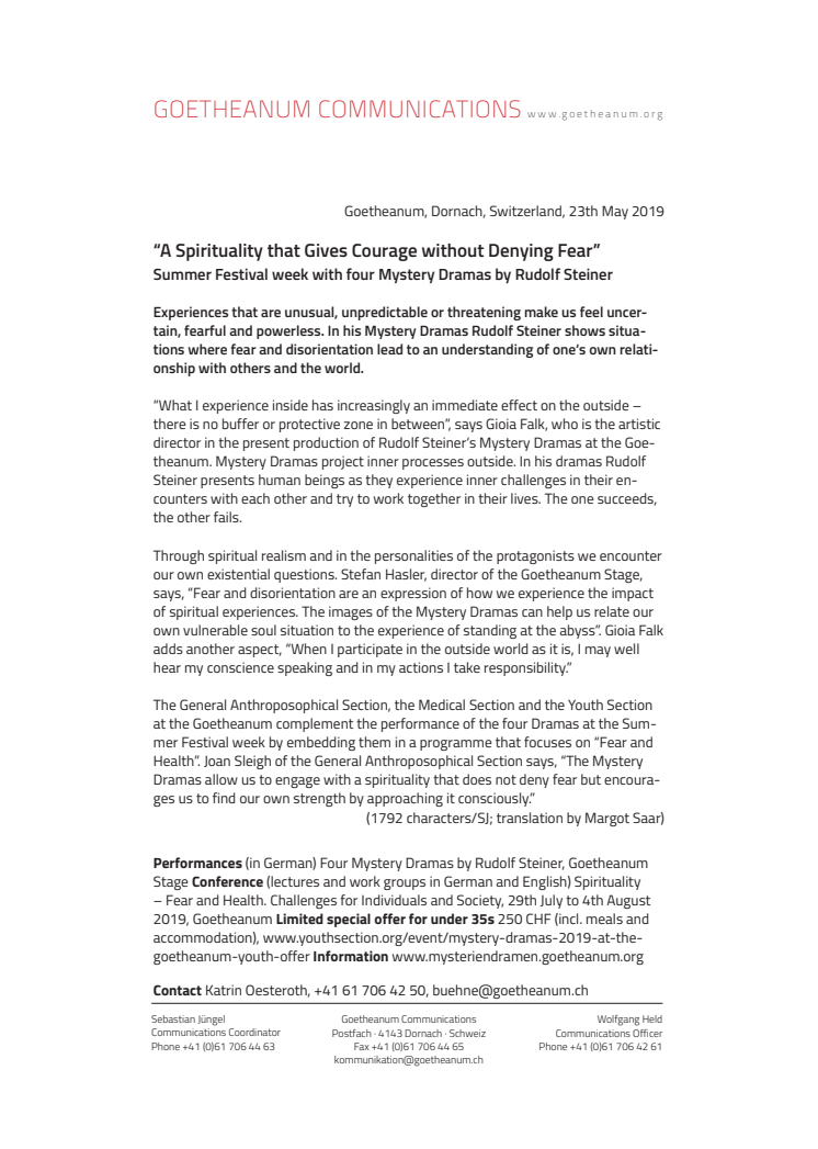 “A Spirituality that Gives Courage without Denying Fear”. Summer Festival week with four Mystery Dramas by Rudolf Steiner