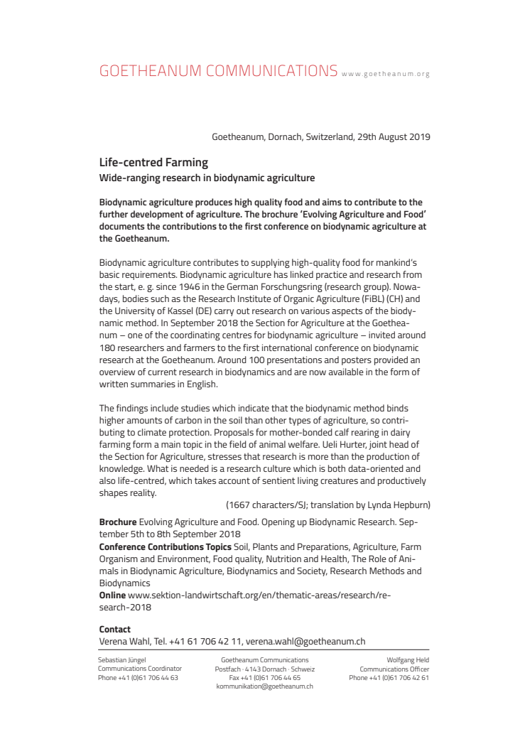 Biodynamic agriculture produces high quality food and aims to contribute to the further development of agriculture. The brochure ‘Evolving Agriculture and Food’ documents the contributions to the first conference on biodynamic agriculture at the Goetheanum.