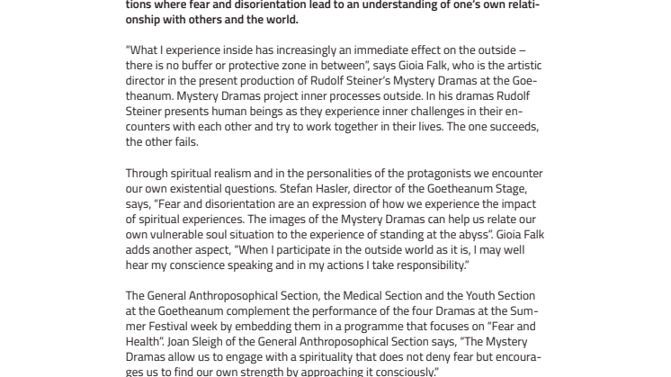 Performances (in German) Four Mystery Dramas by Rudolf Steiner, Goetheanum Stage Conference (lectures and work groups in German and English) Spirituality – Fear and Health. Challenges for Individuals and Society, 29th July to 4th August 2019, Goetheanum Limited special offer for under 35s 250 CHF (incl. meals and accommodation), www.youthsection.org/event/mystery-dramas-2019-at-the-goetheanum-youth-offer Information www.mysteriendramen.goetheanum.org