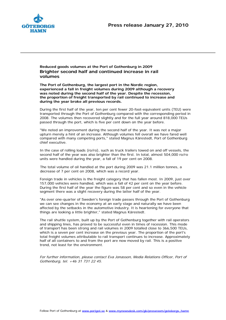 The Port of Gothenburg, the largest port in the Nordic region, experienced a fall in freight volumes during 2009 although a recovery was noted during the second half of the year. Despite the recession, the proportion of freight transported by rail continued to increase and during the year broke all previous records.