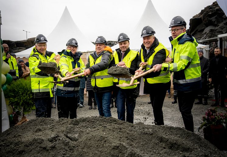 Representatives from Castellum, The Port of Gothenburg, and OneMed take the first shovel in the ground for OneMed's building at Halvorsäng, just north of the port.