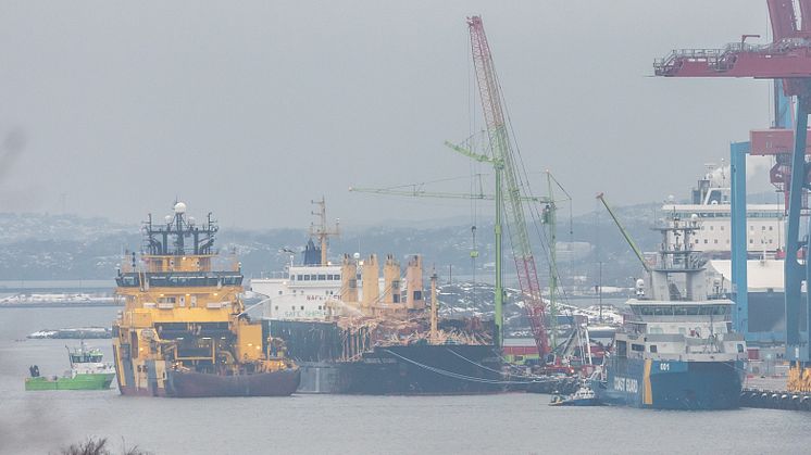 Since the bulk carrier Almirante Storni called at the port of Gothenburg on Saturday, the job of extinguishing and unloading the damaged goods on the ship has been ongoing in parallel. The work has continued during the night until Sunday and continues continuously and according to plan.
