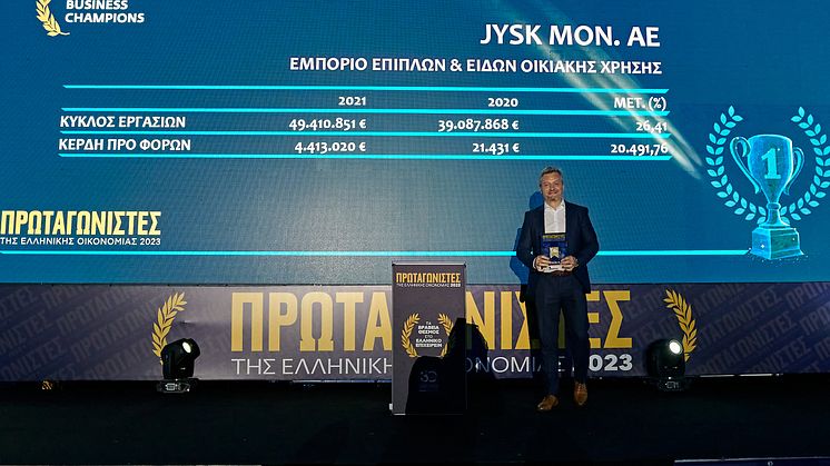 Τα πραγματικά success stories του ελληνικού επιχειρείν τιμήθηκαν στην Τελετή Απονομής των βραβείων-θεσμός για το ελληνικό επιχειρείν, «Πρωταγωνιστές της Ελληνικής Οικονομίας 2023», που διοργάνωσε για όγδοη φορά η Direction Business Network, τη Δευτέρα 17 Ιουλίου 2023. Στη JYSK Ελλάδας απονεμήθηκε το βραβείο Greek Business Champions για τις οικονομικές της επιδόσεις των προηγούμενων χρόνων.