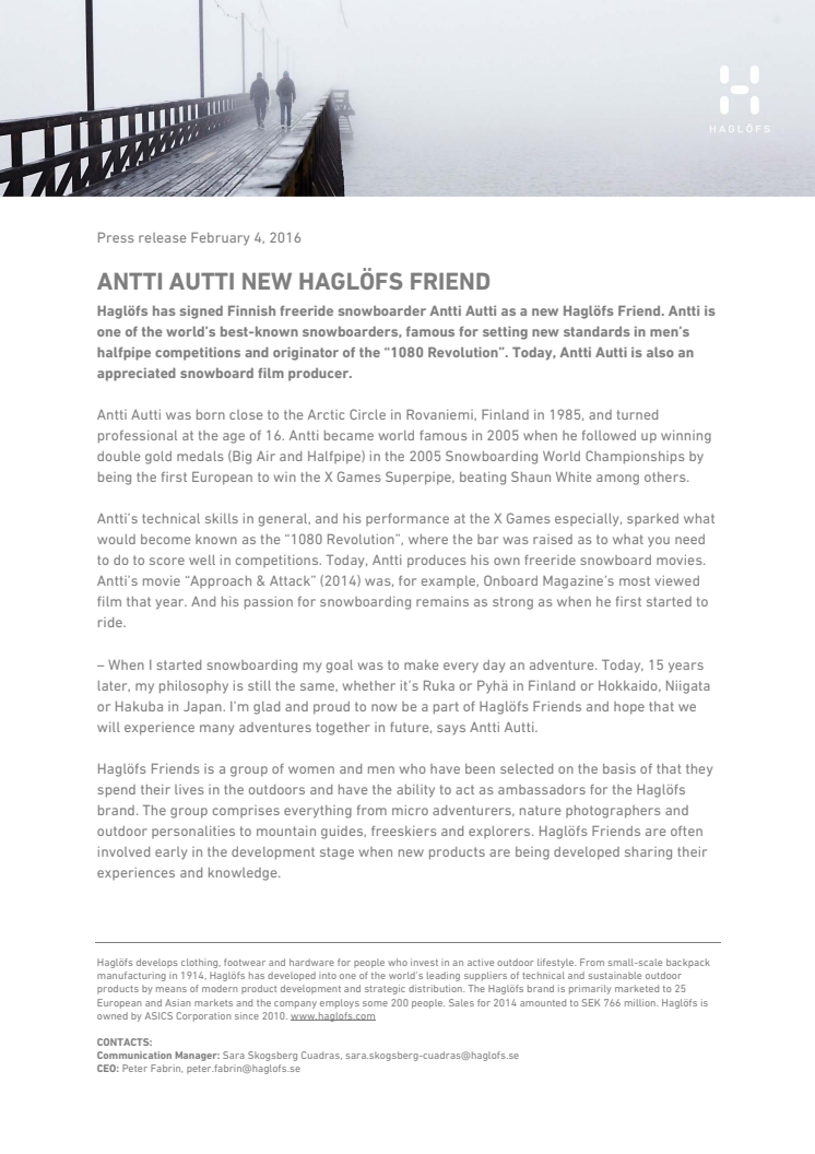Haglöfs has signed Finnish freeride snowboarder Antti Autti as a new Haglöfs Friend. Antti is one of the world’s best-known snowboarders, famous for setting new standards in men’s halfpipe competitions and originator of the “1080 Revolution”. Today, Antti Autti is also an appreciated snowboard film producer.