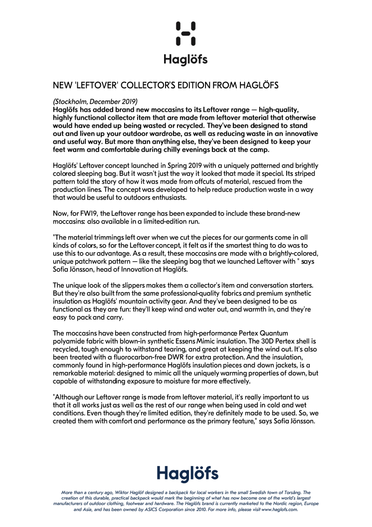 Haglöfs has added brand new moccasins to its Leftover range – high-quality, highly functional collector's item that are made from leftover material that otherwise would have ended up being wasted or recycled. They've been designed to stand out and liven up your outdoor wardrobe, as well as reducing waste in an innovative and useful way.