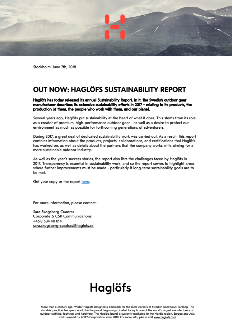 Haglöfs has today released its annual Sustainability Report. In it, the Swedish outdoor gear manufacturer describes its extensive sustainability efforts in 2017 - relating to its products, the production of them, the people who work with them, and our planet.