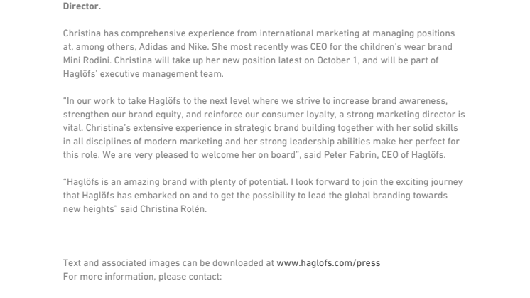 “In our work to take Haglöfs to the next level where we strive to increase brand awareness, strengthen our brand equity, and reinforce our consumer loyalty, a strong marketing director is vital. Christina’s extensive experience in strategic brand building together with her solid skills in all disciplines of modern marketing and her strong leadership abilities make her perfect for this role. We are very pleased to welcome her on board”, said Peter Fabrin, CEO of Haglöfs.