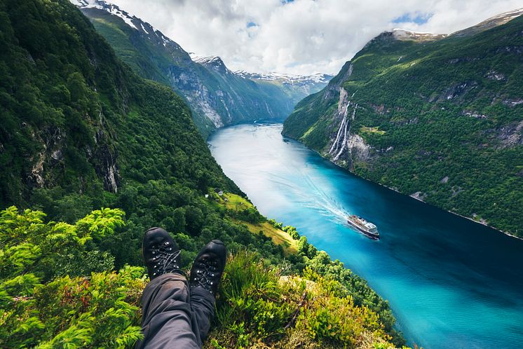 Havila ship passing the Seven sisters waterfalls in the Geirangerfjord.