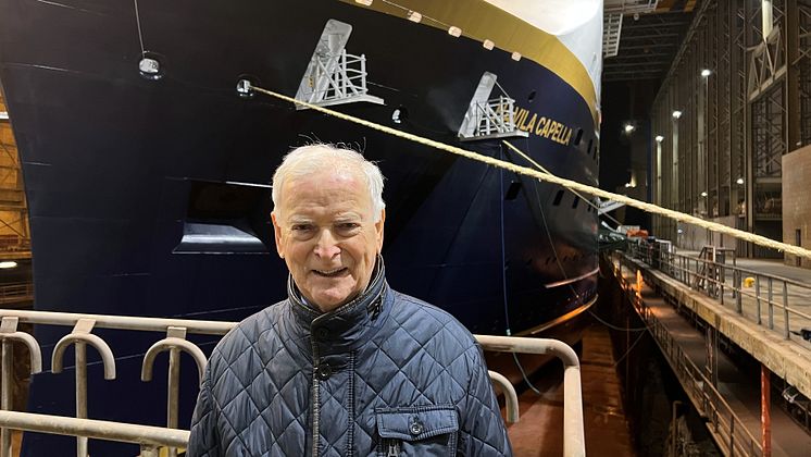 Per Sævik in front of Havila Capella at Westcon shipyard in Florø, Norway