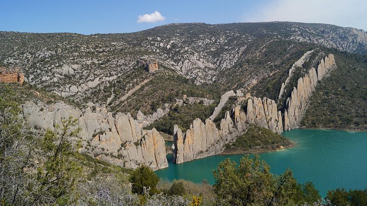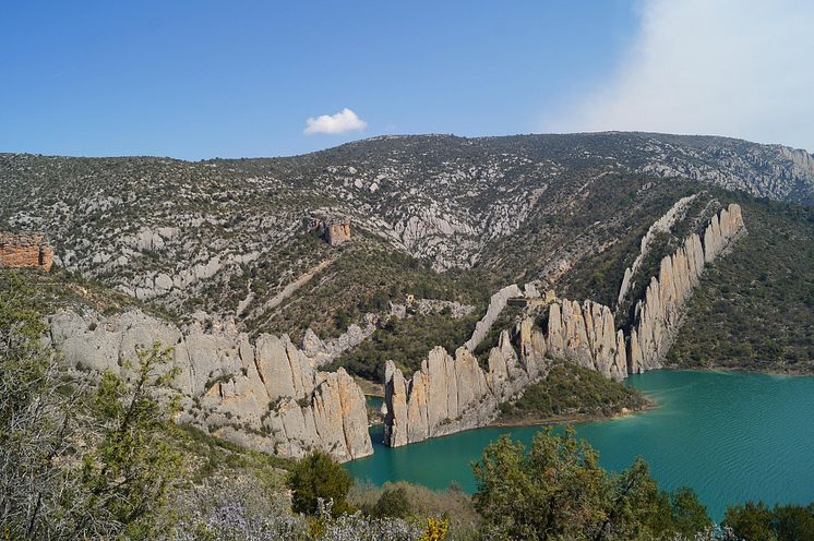 Esta impresionante barrera natural se asienta junto al abandonado pueblo de Finestres, que desapareció con la construcción del Embalse de Canelles. Su nombre original, Roques de la Vila podría perfectamente ser parte de la Fortaleza Roja de Desembarco del Rey.