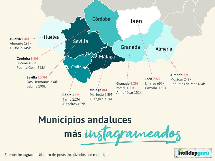 Por el lado contrario, la provincia de Jaén es la única cuya capital no llega al millón (casi 800 mil publicaciones). Destacan en las provincias costeras los núcleos turísticos como Mojácar (249 mil), Motril (180 mil), Tarifa(1.2 millones) o la aldea de El Rocío en Huelva, con 145 mil fotografías subidas en Instagram.