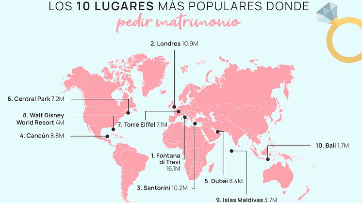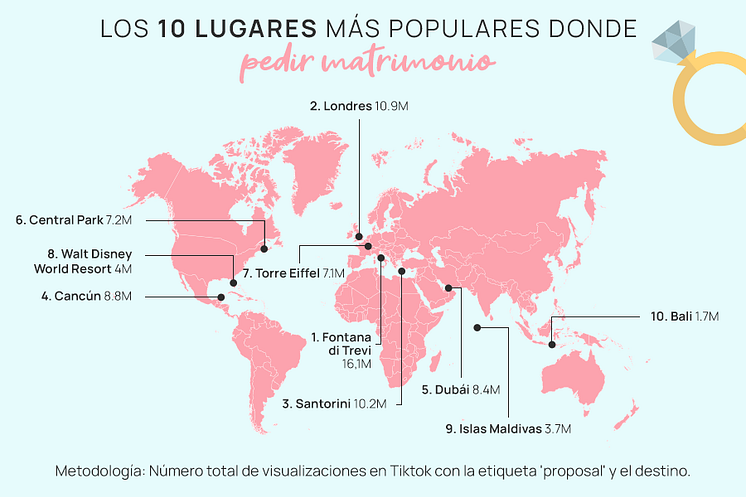 Metodología: Se han filtrado los destinos más populares del mundo y filtrado en Tiktok por la etiqueta ‘Proposal’ más el destino. Posteriormente se han ordenado por numero de visualizaciones y ordenados de mayor a menos, seleccionando los primeros 10 más populares.