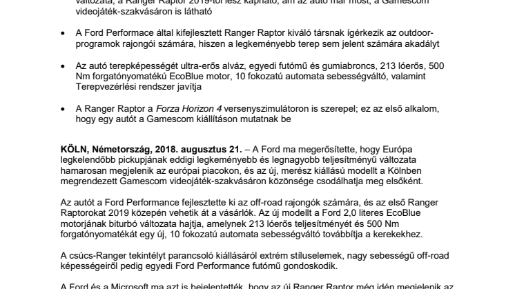 A Ford és a Microsoft ma azt is bejelentették, hogy az új Ranger Raptor még idén megjelenik az új Forza Horizon 4 versenyszimulátoron, még nagyobb teljesítménnyel nyűgözve le a vezetés szerelmeseit, és lehetőséget kínálva a játékosoknak, hogy már a piaci bemutatás előtt megtapasztalják az autó páratlan képességeit.