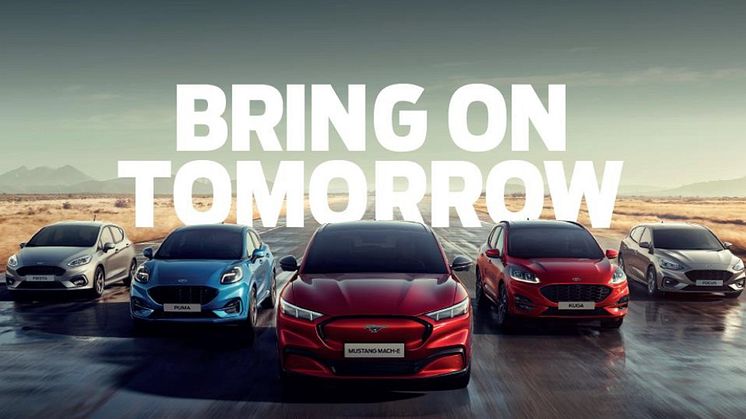 Az első “Bring on Tomorrow” TV-reklámban a kifejezetten elektromos hajtásra tervezett Mustang Mach-E szerepel, felidézve a Mustang szabadsággal, haladó szemlélettel, száguldással és lázadással fűszerezett szellemiségét, és megtestesítve a Ford erős elkötelezettségét az elektromos hajtás jövője iránt.