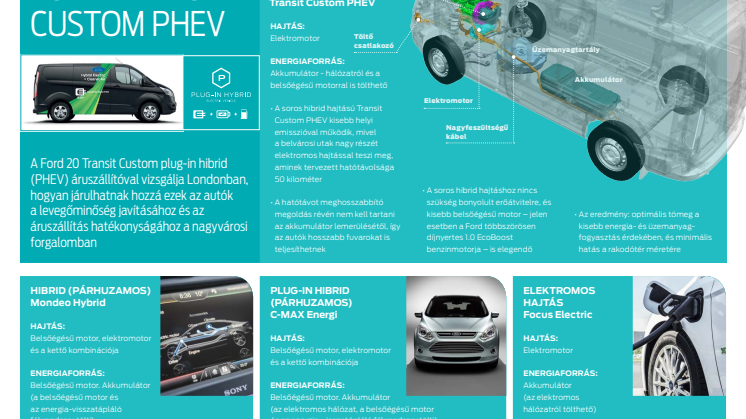 A Transit Custom PHEV a vállalat azon törekvésének szellemében született, hogy a Ford megfizethető és sokoldalú elektromos járműveket kínáljon vásárlóinak. Az új modell 2017 végén tűnik fel először a közutakon, amikor a Ford 20 darab PHEV-hajtású Transitot ad át flottaüzemeltetők számára egy 12 hónapos londoni kísérlethez. A projekt azt vizsgálja majd, milyen mértékben járulhatnak hozzá az alacsony károsanyag-kibocsátású, plug-in hibrid hajtású elektromos járművek a levegőminőség javításához, miközben fokozzák az áruszállítás hatékonyságát a nagyvárosi forgalomban, amely a legkeményebb munkakörnyezetet jelenti a haszongépjárművek számára.