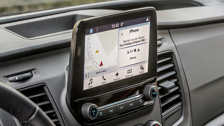 A SYNC 3 rendszeren keresztül a Transit Custom vezetője egyszerűen kezelheti az audiorendszer, a navigáció és a csatlakoztatott okostelefonok funkcióit. A berendezés kompatibilis az Apple CarPlay és az Android Auto™ rendszerekkel.