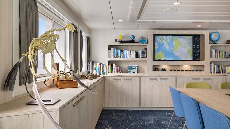 The ship’s newly built Science Center—located on Deck 6—sits at the heart of the onboard guest experience, reflecting HX’s strong focus on science and education. Designed to support discovery and hands-on learning, the sleek new Center features interactive screens, flexible lecture space, a small library, and dedicated workstations for citizen science.