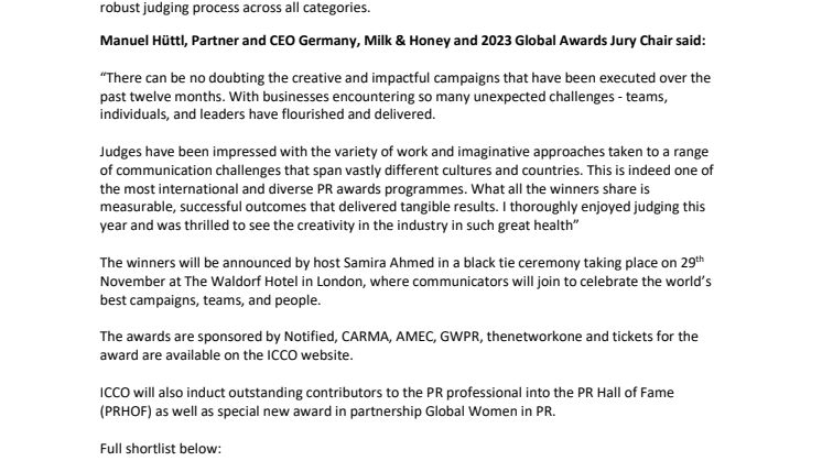 ICCO will also induct outstanding contributors to the PR professional into the PR Hall of Fame (PRHOF) as well as special new award in partnership Global Women in PR.